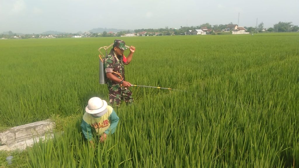 Babinsa Koramil Sutojayan Bantu Penyemprotan Pestisida Pada Tanaman Padi di Sawah Milik Warga Binaannya