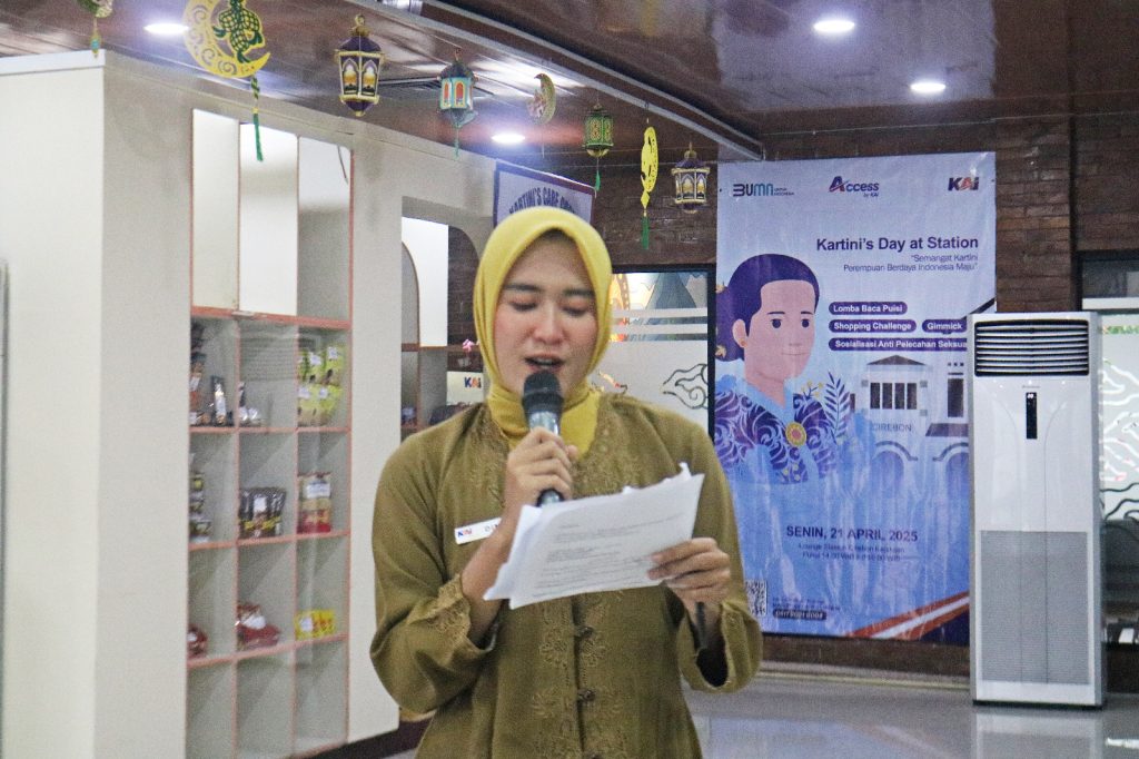 “Dalam rangka memeriahkan, sekaligus mengingatkan kembali kepada masyarakat akan pentingnya arti emansipasi perempuan, hari ini, dalam peringatan Hari Kartini, KAI Daop 3 Cirebon menyapa penumpang dan menggelar acara Lomba Baca Puisi di Stasiun Cirebon. Selain itu KAI juga membagikan souvenir kepada para penumpang di ruang tunggu Stasiun Cirebon dan di dalam rangkaian KA Cakrabuna yang menunggu keberangkatan pukul 16.00 WIB dari Stasiun Cirebon,” ujar Muhibbuddin, Manager Humas KAI Daop 3 Cirebon.