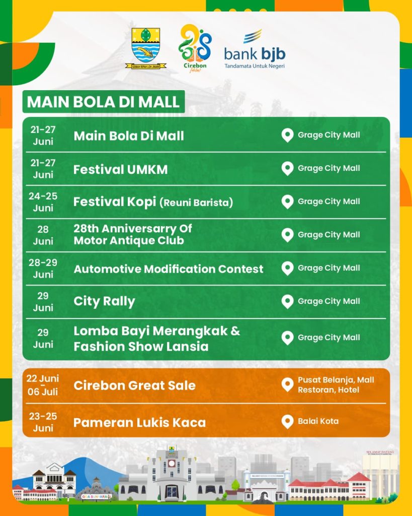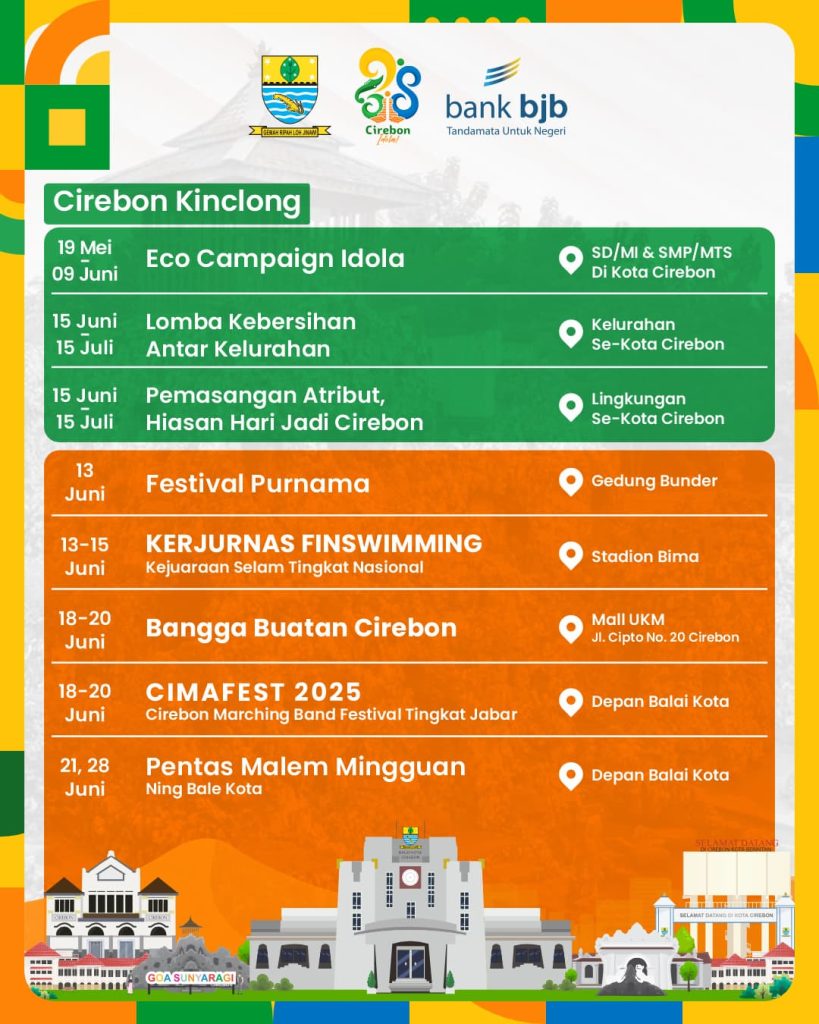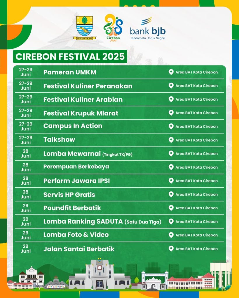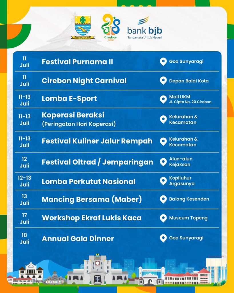 Pemerintah Kota Cirebon menghadirkan lebih dari 40 rangkaian kegiatan yang berlangsung dari Mei hingga Juli 2025. Kegiatan ini dirancang tidak hanya untuk memperingati sejarah panjang Kota Udang, tetapi juga untuk menghidupkan perekonomian lokal, meningkatkan kunjungan wisata, serta memperluas partisipasi masyarakat dari semua lapisan.
