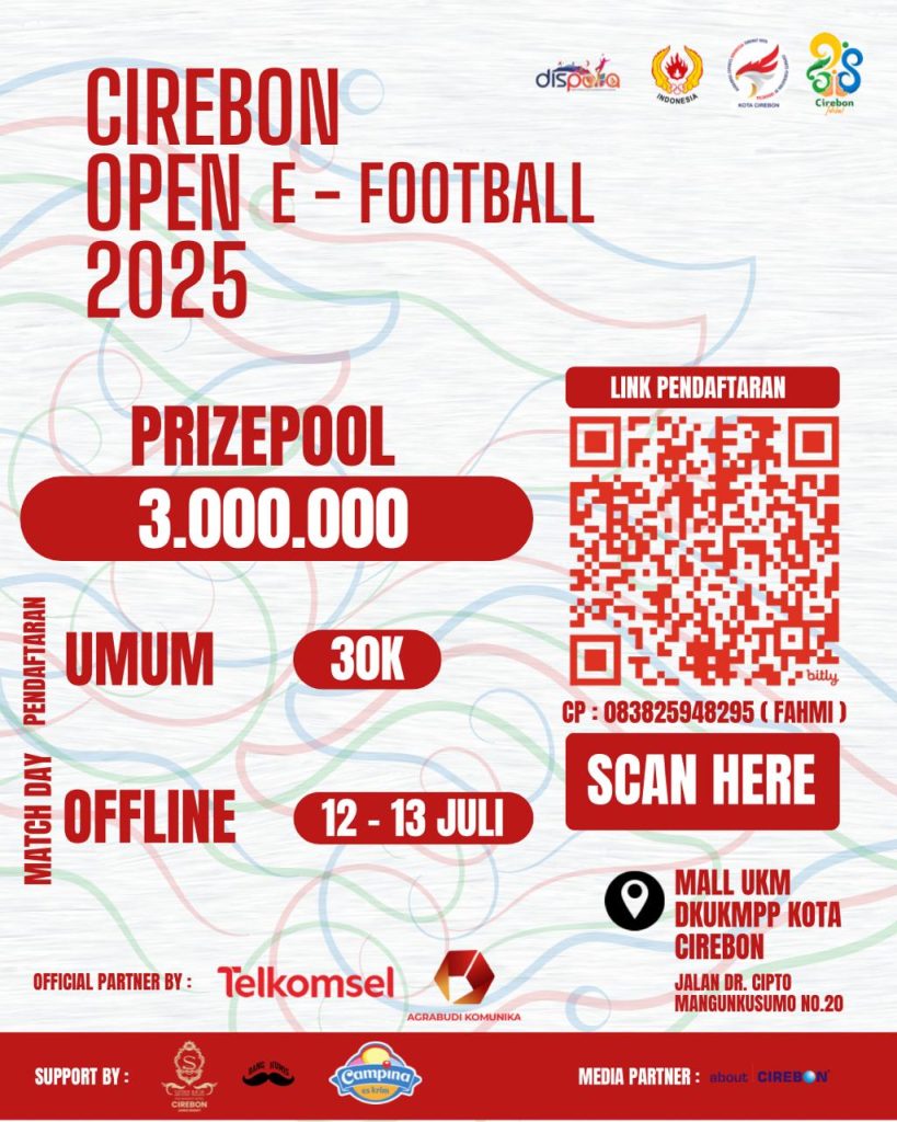 “Kami berharap dengan adanya turnamen ini bisa menjadi tempat berkumpulnya komunitas pecinta game, mempererat hubungan antarpemain, dan meningkatkan semangat sportif. Bagi yang berminat, bisa mendaftar secara online lewat media sosial Turnamen Esport Cirebon Open, atau langsung menghubungi panitia,” tambahnya.