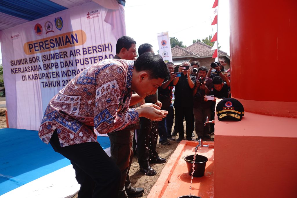 “Program ini adalah hasil kerja sama antara BNPB dan Pusterad. Pelaksanaan di lapangan dilakukan oleh TNI AD. Hingga saat ini sudah ada delapan titik sumur bor di Indramayu. Seluruh air yang dihasilkan telah diuji laboratorium dan layak konsumsi,” jelasnya.