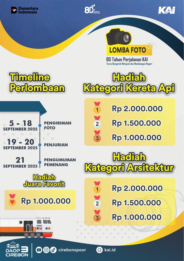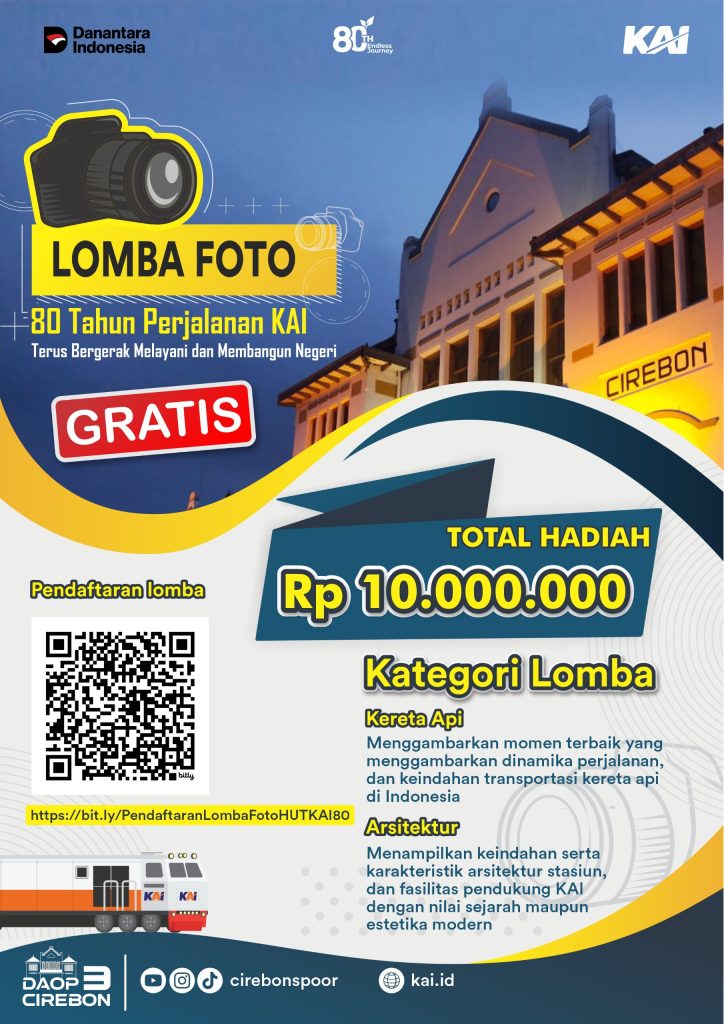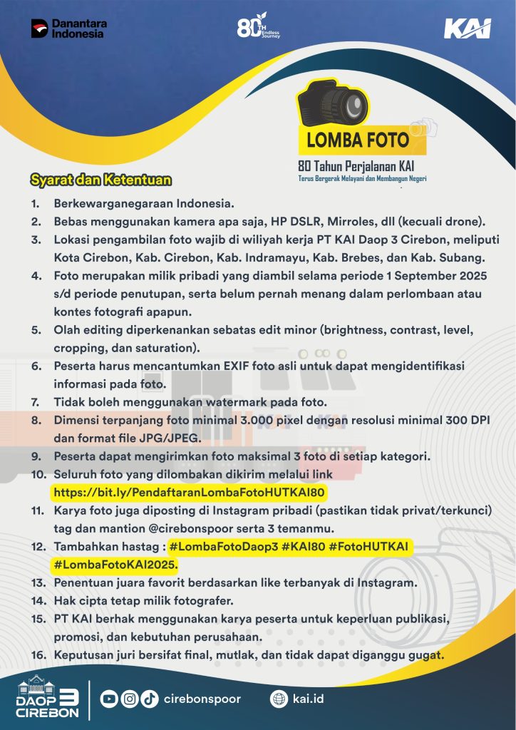 KAI Daop 3 Cirebon menggelar lomba foto dengan tema “80 Tahun Perjalanan KAI Terus Bergerak Melayani dan Membangun Negeri” untuk memeriahkan peringatan HUT ke-80 KA. Lomba foto yang berlangsung mulai 5 hingga 18 September 2025 ini merupakan upaya KAI Daop 3 Cirebon untuk semakin mendekatkan diri dengan masyarakat dan komunitas pecinta kereta api.