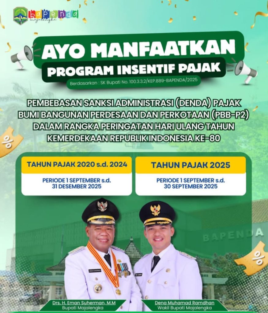 Untuk meringankan beban masyarakat Pemerintah Kabupaten (Pemkab) Majalengka, secara resmi memberikan insentif pemutihan denda Pajak Bumi dan Bangunan Perdesaan dan Perkotaan (PBB-P2)