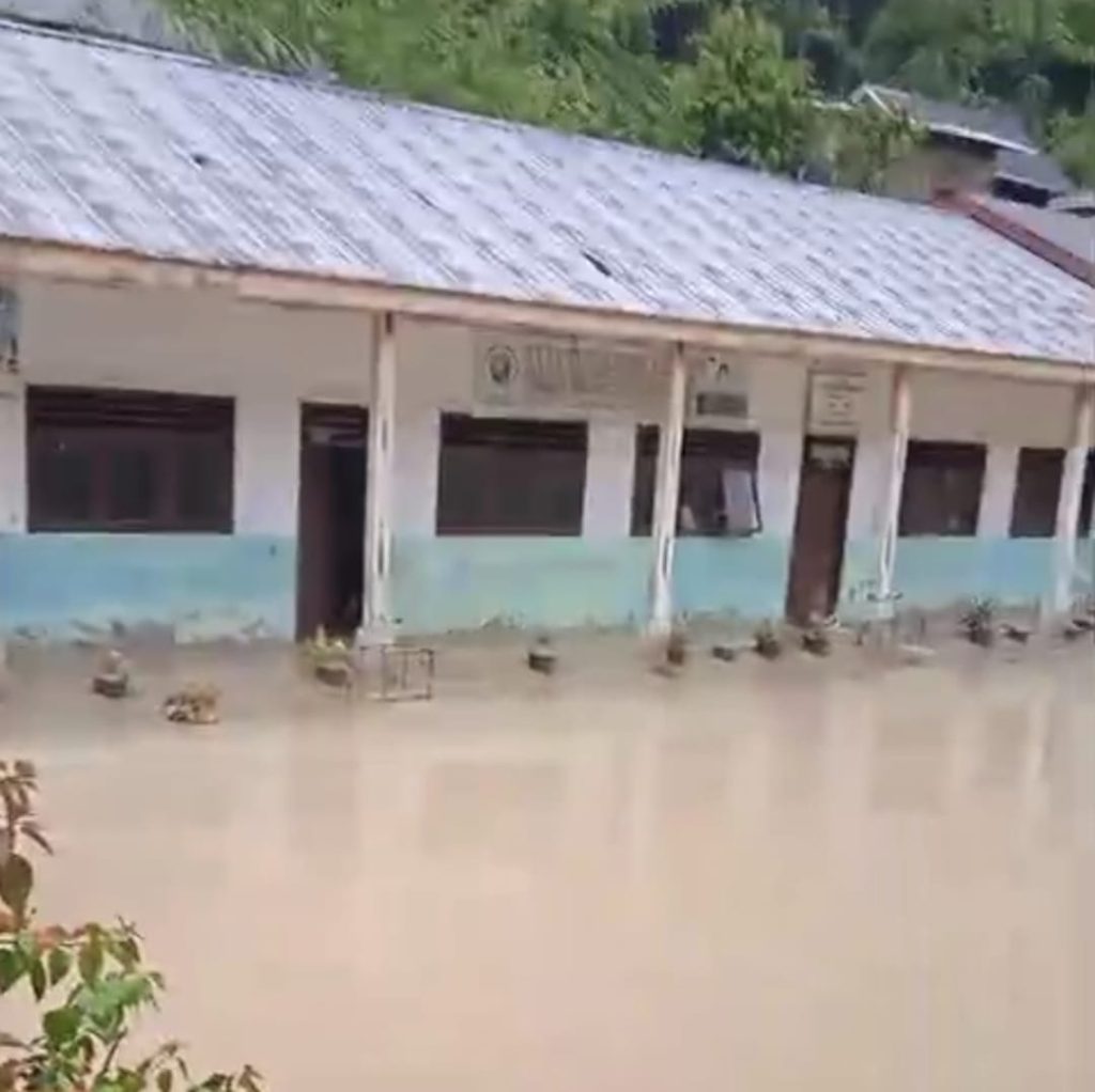 ‎Dibibir sungai Aek Sibuluan, bangunan sekolah SD tampak seperti maket yang direndam air. Meja dan kursi terapung, buku-buku rusak, dan papan tulis yang masih menyimpan tulisan pelajaran sebelumnya.